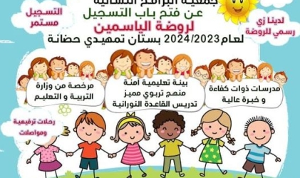 تعلن روضة روضة الياسمين التابعة لجمعية البرامج النسائية عن بدأ التسجيل للسنة الدراسية الجديدة لعام2024/2023 في مقر روضة الياسمين الكائن في منطقة الحاووز بجوار مدرسة زهرة