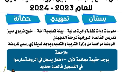 تعلن روضة روضة الياسمين التابعة لجمعية البرامج النسائية عن بدأ التسجيل للسنة الدراسية الجديدة وذلك يوم الثلاثاء الموافق 1/8/2023 لعام2024/2023 في مقر روضة الياسمين الكائن في منطقة الحاووز بجوار مدرسة زهرة